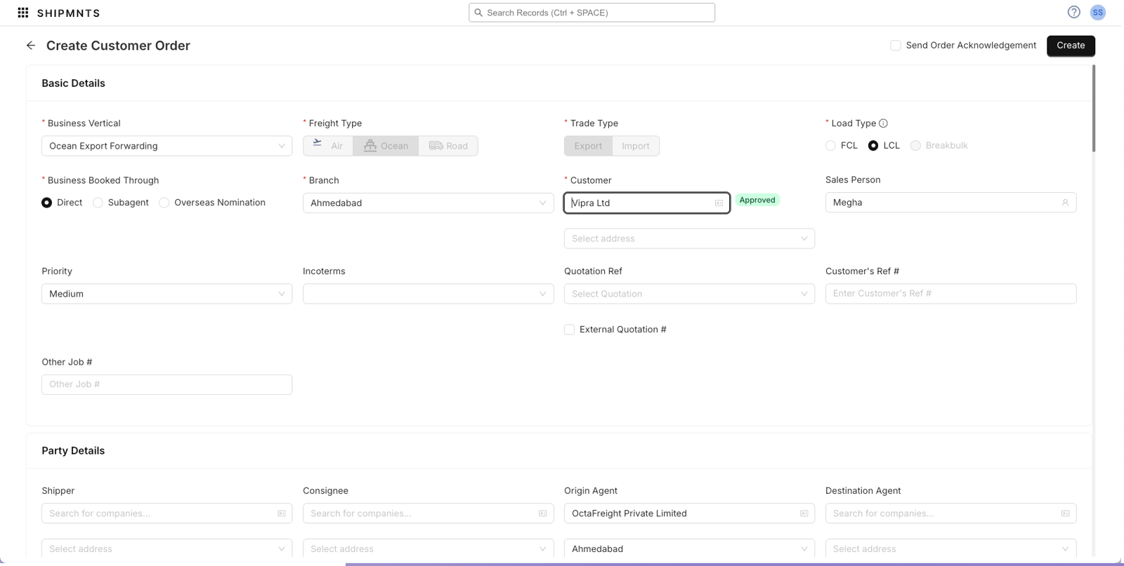 8. You will notice most of the basic and charge details will be pre-filled and get carried forward from the won inquiry.