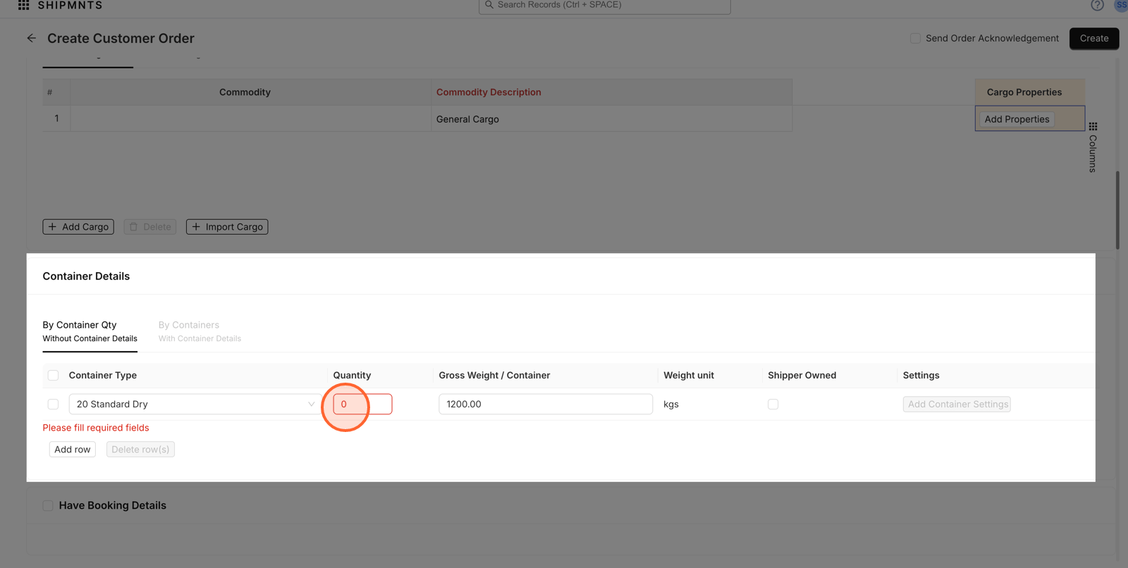 6. Enter the number of containers required for your shipment.